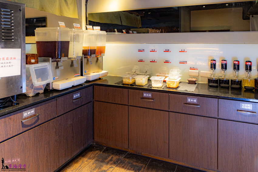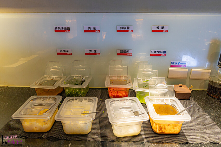 有著日式醬油、台式醬油、黑醋、白醋、香油、沙茶醬、胡麻醬和各種辛香料都放置在此,可以依照自己的喜好拿取。