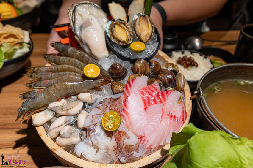 有著日本大生蠔、鮑魚、蛤蜊、鯛魚、透抽、蚵仔、左右兩側的蝦子是藍鑽蝦、中間是白蝦,底層還有用著冰塊保鮮,還有著小鳥居的擺飾來營造日本氛圍。