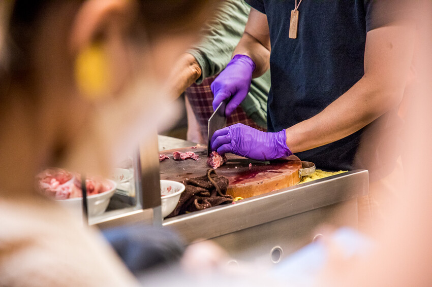 冷藏櫃裡還有一顆顆豬心,都是等用完了才會在切,第一次看到豬心,原來豬心這麼大顆啊