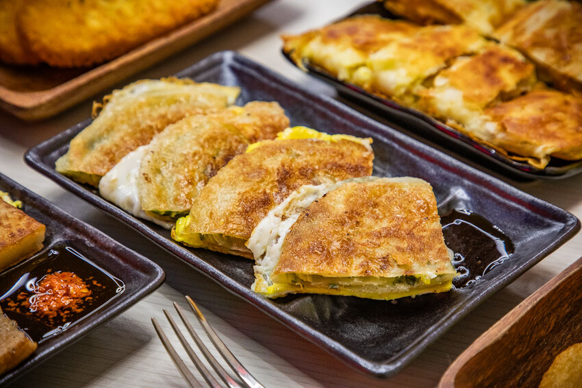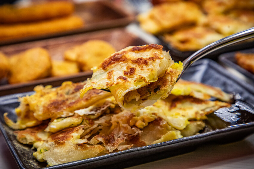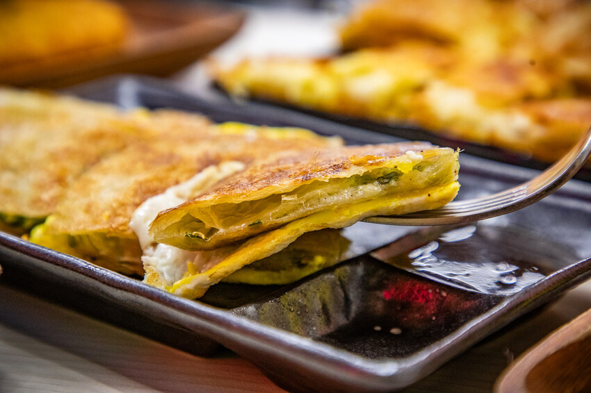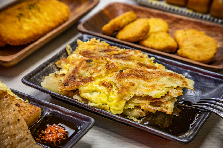 蔥油餅,這蔥油餅也是很厲害,有眷村口味的蔥油餅,外表不油膩而且很酥香,裡面是一層一層的口感也很濕潤,蔥還保留著甜度水分,微微的鹹度超涮嘴,加蛋一起煎增加多層次的豐富口感