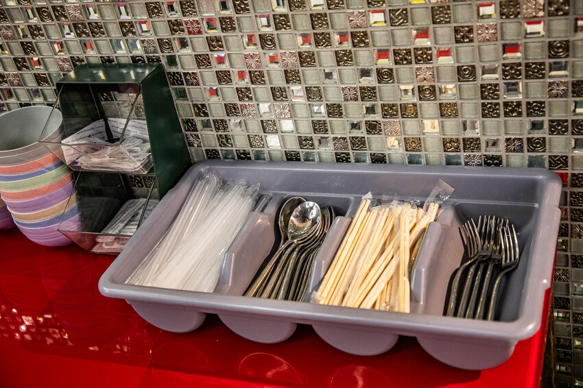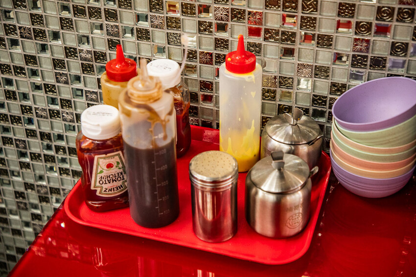 店裡屬於自助式服務,如需醬料或餐具皆可自取,辣椒醬很夠味,愛吃辣的可以加