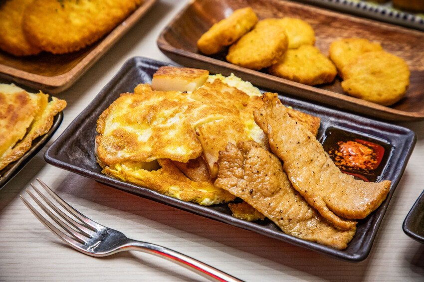 蘿蔔糕,拿靠早午餐招牌之二,而且還有加豬排唷,蘿蔔糕也是煎到兩面金黃焦脆,起鍋前再淋上蛋液,讓蛋包裹蘿蔔糕,蛋香濃郁蘿蔔糕外脆內嫩,可以夾著豬排一起吃,超好吃