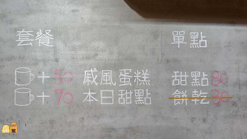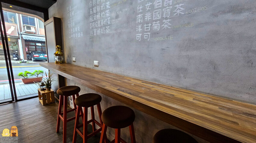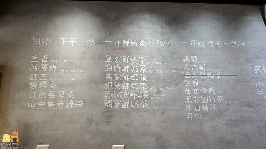 工業風的牆壁上使用粉筆在牆上填寫菜單,雖然只有簡單的紅茶跟鮮奶茶還有蛋糕可選