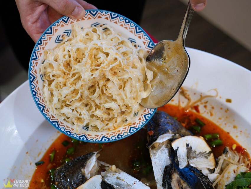▲魚頭燴麵是額外單點的,單點價格48元,他其實就是灑了白芝麻的緞帶麵,麵條口感蠻Q的,泡在湯裡麵煮一會兒,讓麵條充分吸收湯汁後就可以直接夾起來吃囉👌