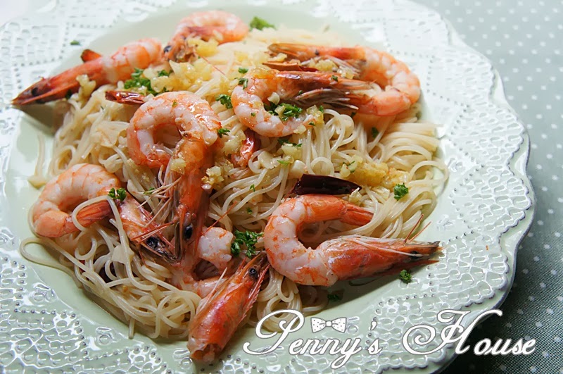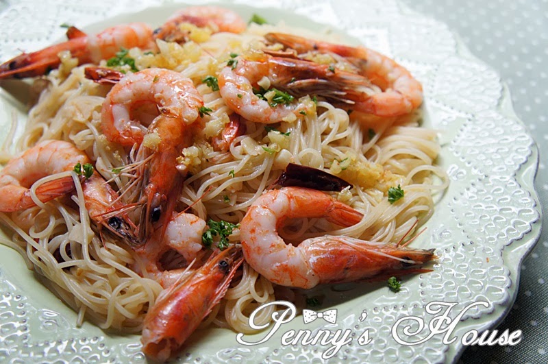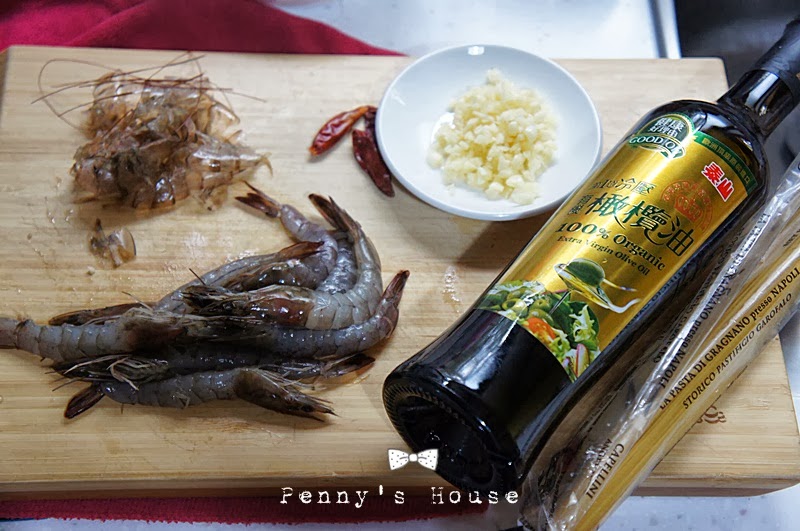 食材:湧升海洋生態蝦8尾 、蒜頭5顆、乾辣椒3小條、橄欖油、義大利麵條。