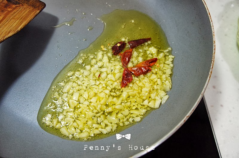 步驟1:冷鍋放入橄欖油、蒜末、乾辣椒,小火爆香,倒出備用~