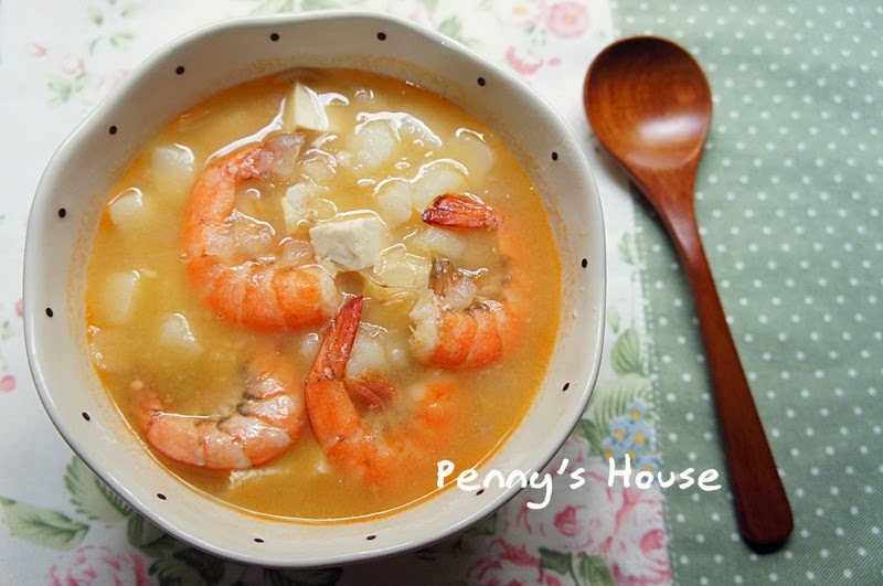 加入馬鈴薯丁一起熬煮,起鍋前加入些許味噌、豆腐丁,再加入蝦子滾一下即可起鍋。