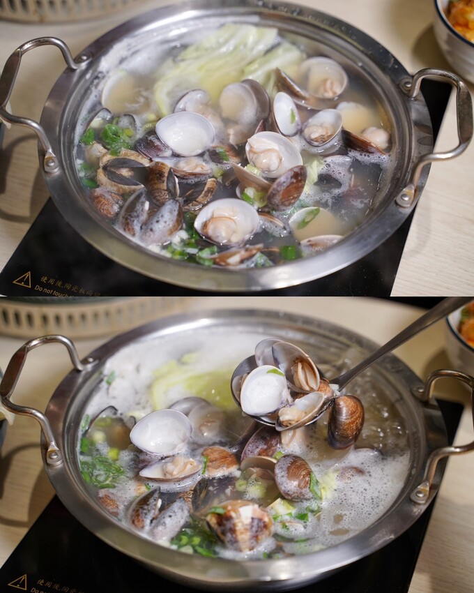 比起熊熊牛奶鍋,我更推薦升級成啵啵蛤蜊鍋,裡頭有整整一斤重的滿鍋蛤蜊,湯頭鮮甜且充滿濃濃蒜香,光吃鍋底就超滿足!
