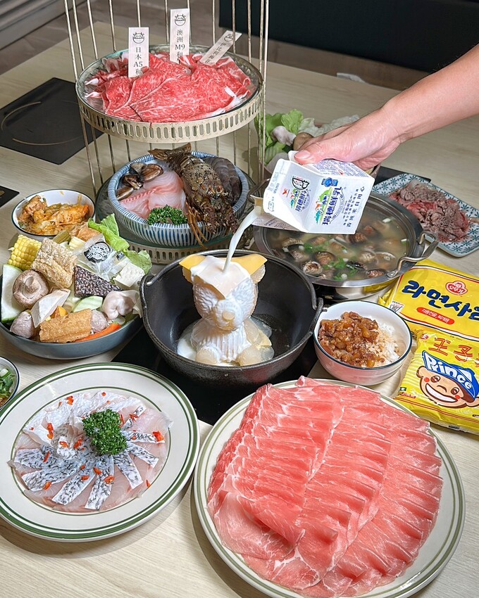 湯底部分多達26種選擇,傳統鍋、爆炒鍋以及特色鍋通通都有,牛奶鍋系列會給整平高大鮮乳,比較特別口味有酸菜魚鍋、燒酒雞鍋、馬告豬肚鍋,湯底都是使用每日現熬的蔬果大骨湯。除了單人鍋之外,也有提供2-4人套餐,肉片搭海鮮、純肉片、純海鮮通通都有,也有提供素食鍋可以選擇,平日中午來用餐,更還有限定的商業午餐,只要$298元,CP值真的超高!