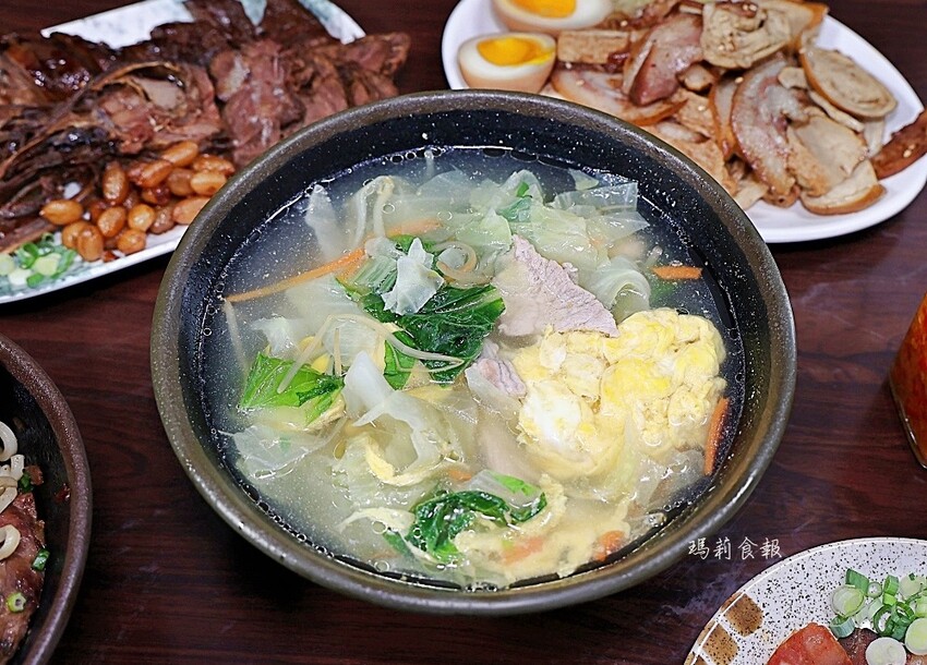鮮饌小館的豬肉熗鍋湯裡有蛋花、新鮮蔬菜與豬肉。