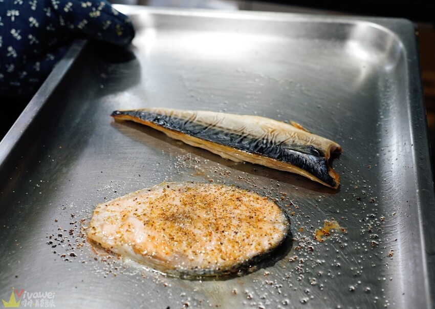 ▲店家提供的魚類品項有四款,有黃金蒲燒鯛魚、麻辣水煮魚、挪威鹽烤鯖魚、義式香料鮭魚!我們這天吃到的是現烤的挪威鹽烤鯖魚及義式香料鮭魚🤩