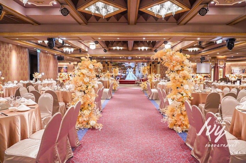 在凡爾賽宮有一面超美背板,清新浪漫的風格在這相當顯眼,加上暖黃色調的配色和花藝佈景,可以襯托出新人與賓客的美。