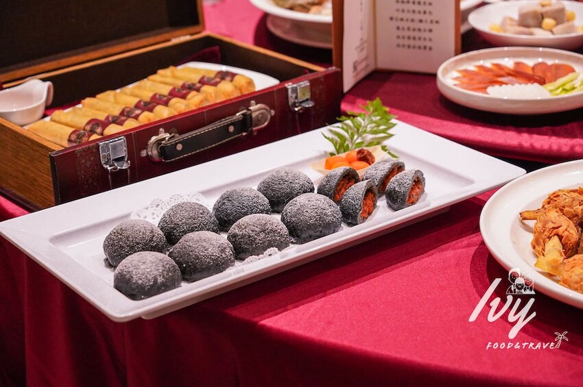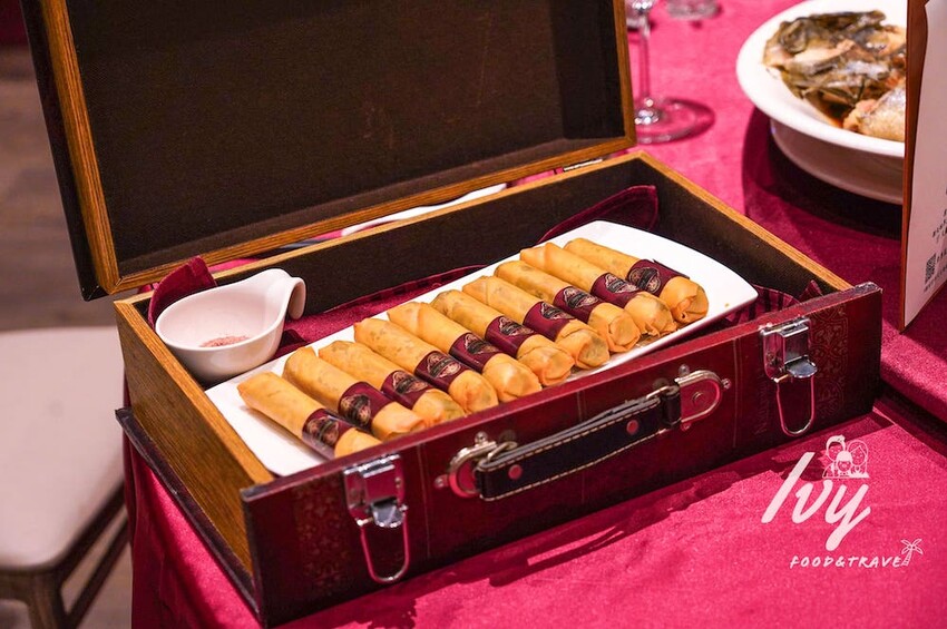 復古珠寶盒一上桌瞬間成全場焦點,香濃不甜膩的芝麻餡,包覆餅皮油炸成金黃酥脆,佐上酸酸甜甜的梅粉,不論口感、味道層次都很豐富,真的是一道新穎時尚的婚宴料理。