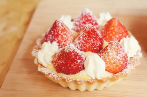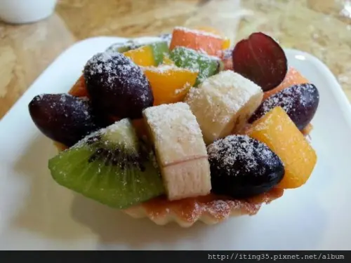 水果塔,上面鋪了滿滿的各式水果,水果下面是濃郁甜蜜的卡士達醬。