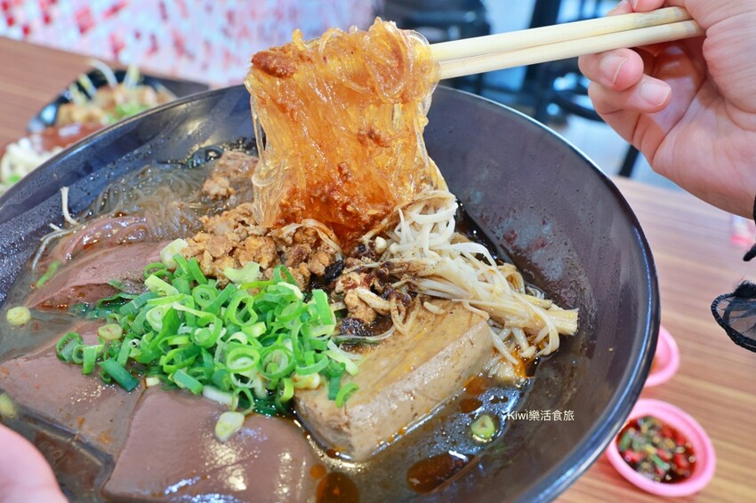 攪拌均勻後食用,彈牙的麵條口感很厲害,想加點辣都可以到自助區域中取用,這樣一碗古早味滿滿的料理,能吃到真的很幸福。