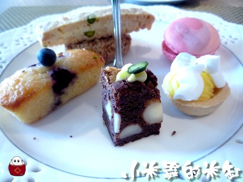 下層甜點有馬卡龍、蛋白檸檬塔、榛果布朗尼、椰子蛋糕、義大利比士奇餅乾
