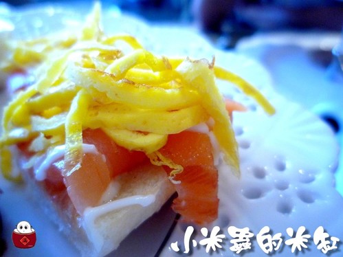 吐司烤的脆脆的後,塗上美乃滋再放上煙燻鮭魚以及蛋絲