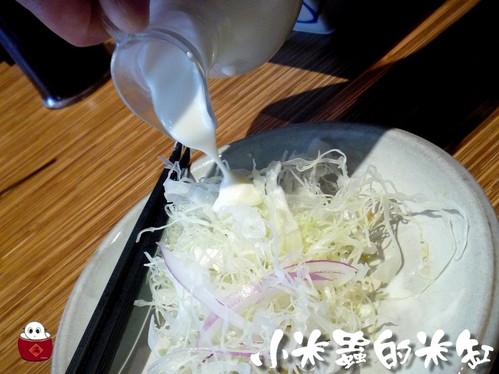 無限量供應的高麗菜絲是來自於武陵農場,可以搭配柚子醋(黑)或是紫蘇沙拉醬(白)