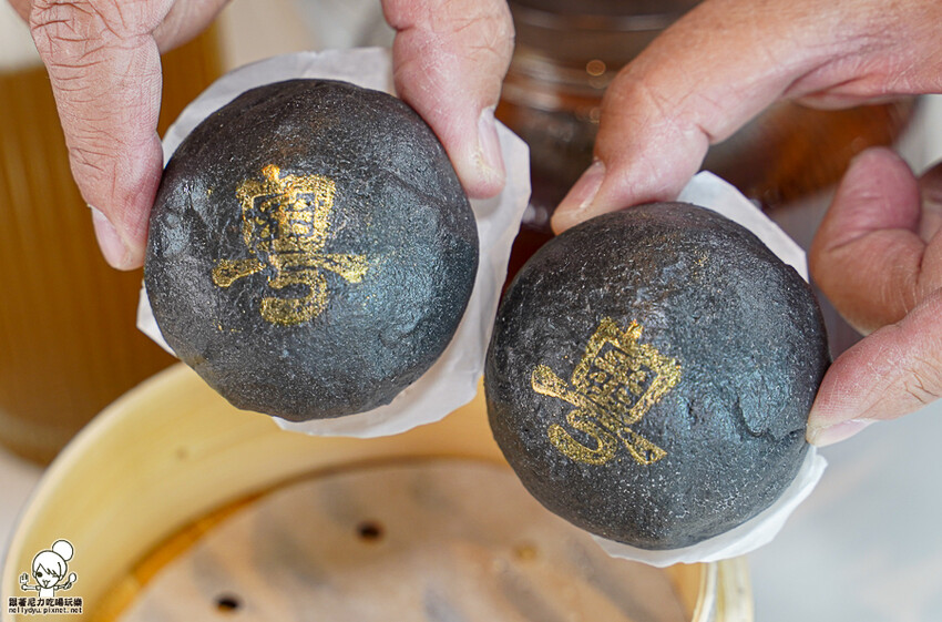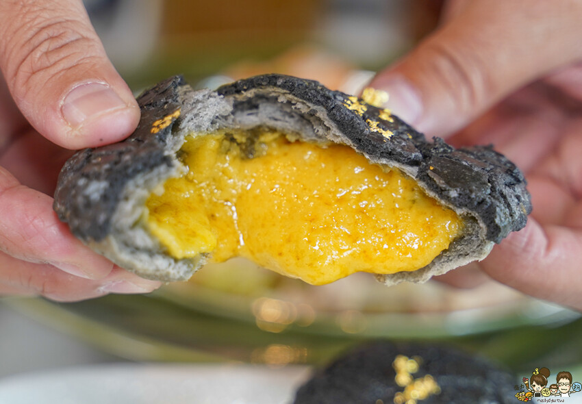 招牌必點的黑金流沙包,使用竹炭製作熱印金色粵,蠻美的