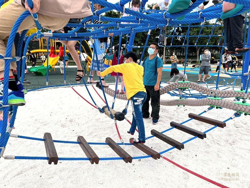 這些設施跟以往的罐頭式的遊樂場不同,除提供所有孩童一同遊戲,也應允了家長的放鬆需求,可以在一旁看著孩子們玩的空間,這是個親子共融的友善運動公園