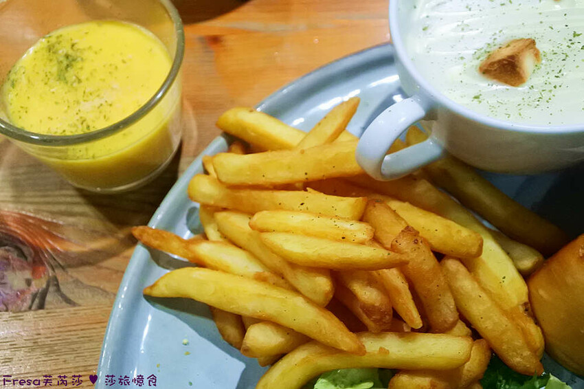 餐盤包含烤麵包、生菜沙拉、濃湯、薯條、起司醬.