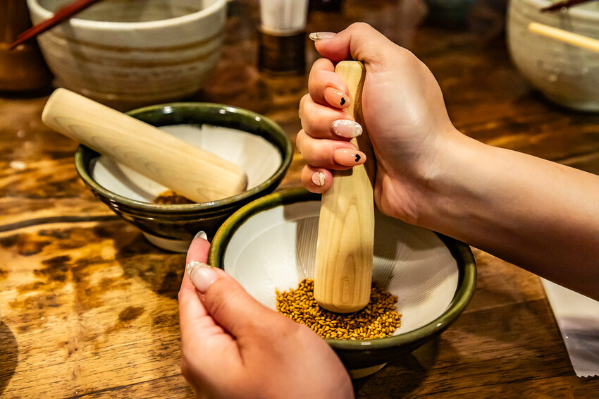 豬排都是現點現炸,需要等候一段時間,等待的時間可以用來磨芝麻,芝麻有先焙炒過,大概稍微磨一下就超香的,磨好的芝麻再加入由伍斯特醬特調的豬排醬調和就可以了