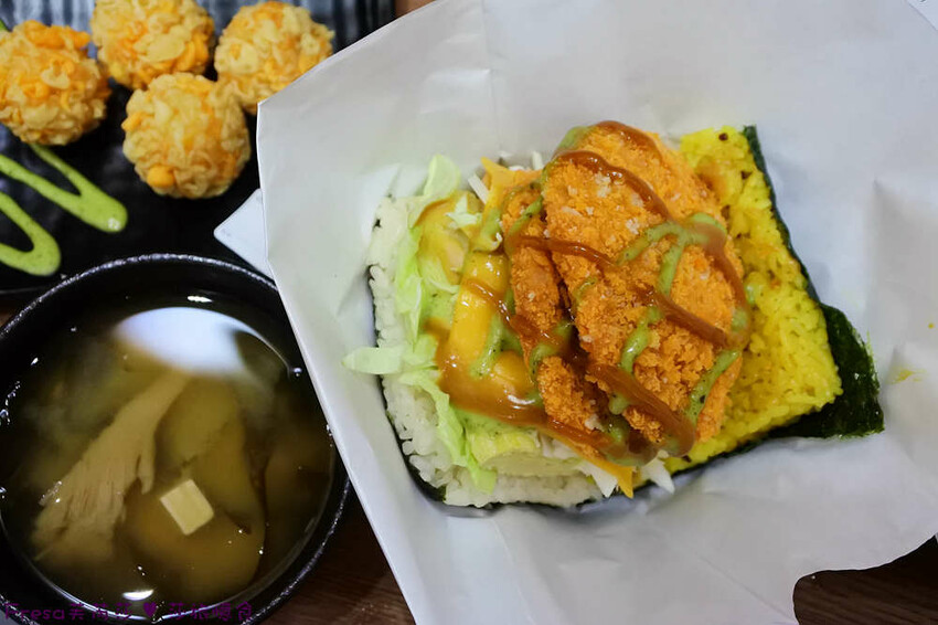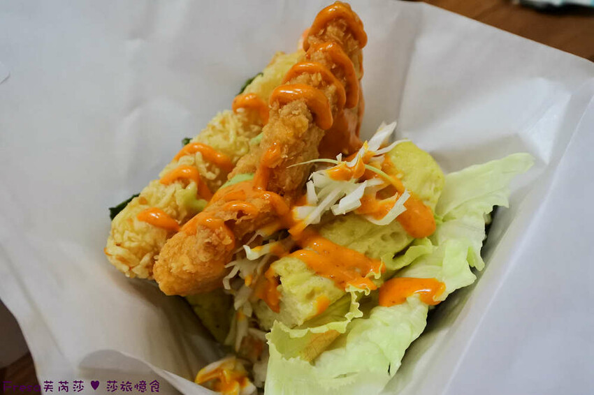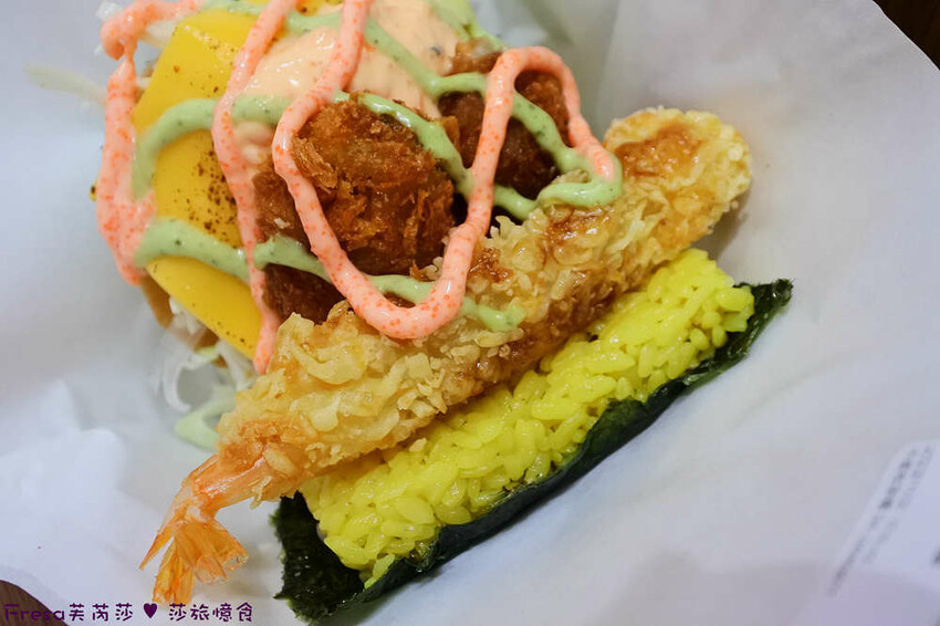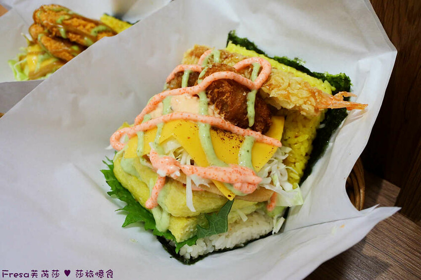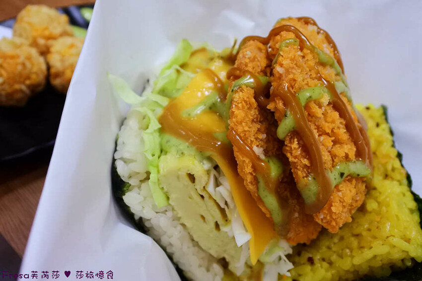 台中一中商圈沖繩飯糰「不握松飯糰」中友百貨附近美食.巨無霸雙色海陸大飯糰.豬排蝦排牡蠣雙蛋太霸氣