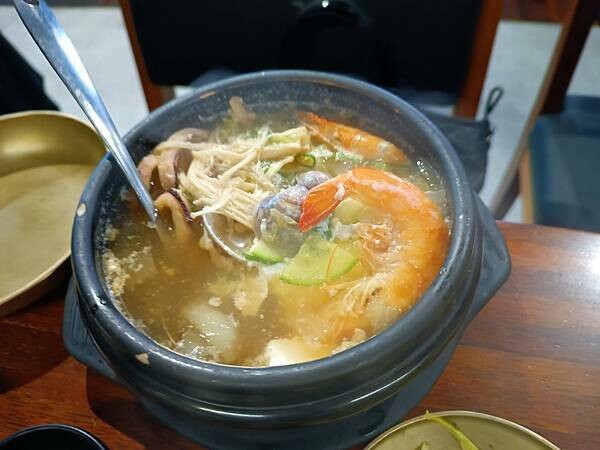 海鮮嫩豆腐鍋料多,湯頭喝起來非常鮮甜