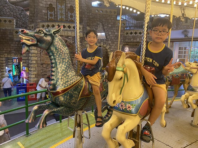 除了旋轉木馬之外,還有駱駝、老虎、飛馬....等特殊造型動物可以選擇,佐佑還曾經為了搶坐一隻飛馬而小吵架呢!