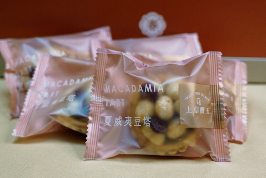 上信饌玉以堅果甜點為主!有夏威夷豆塔、咖啡豆塔、巧克力胡桃塔、柚香豆塔、椒香豆塔與海苔豆塔六種。