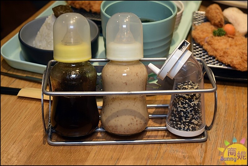 入座後我先看到桌上的豬排醬及沙拉醬,竟然是奶瓶造型超級可愛!!