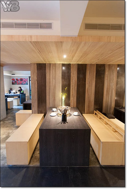 以原木和裸露的水泥牆面表現出獨特的空間對比~