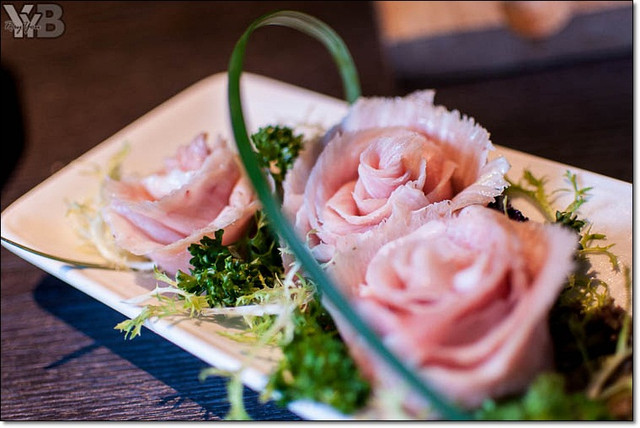 以珍貴的豬頸肉和精湛的刀功,用盛開的玫瑰花造型將豬頸肉完美呈現~