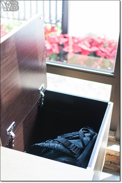 而提供顧客的長型木椅,底下還有寬敞的收納空間~