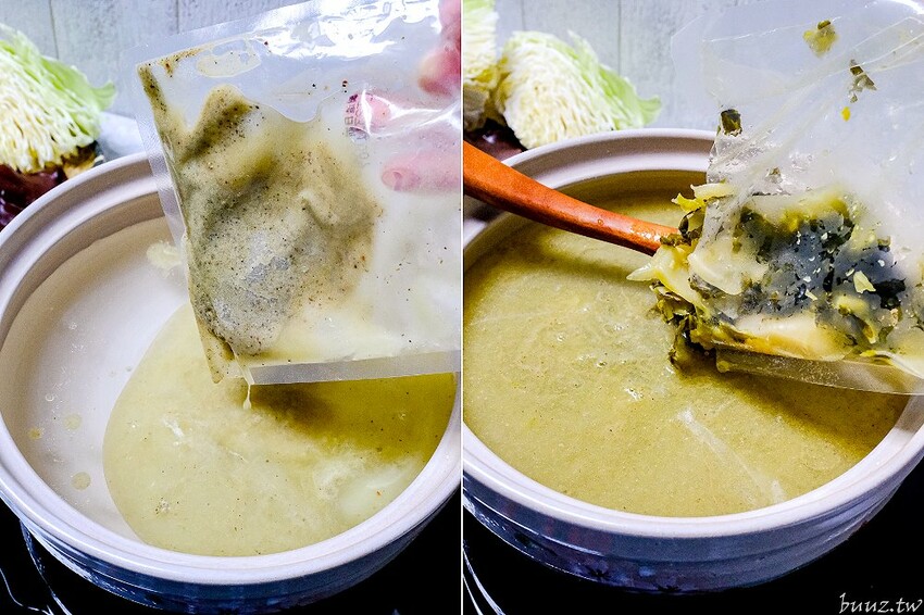 基本上這鍋單純只有酸菜包裡面的配料,煮起來感覺也挺豐富的,幾乎還原了在現場吃的模樣,帶點乳白色的湯頭,喝起來整個酸辣舒爽,超過癮阿~