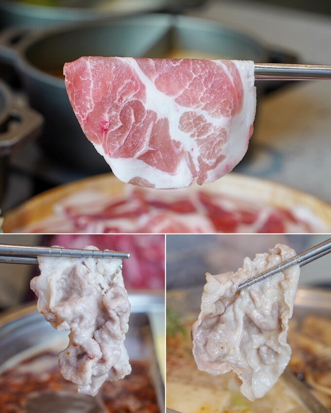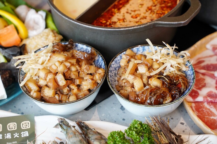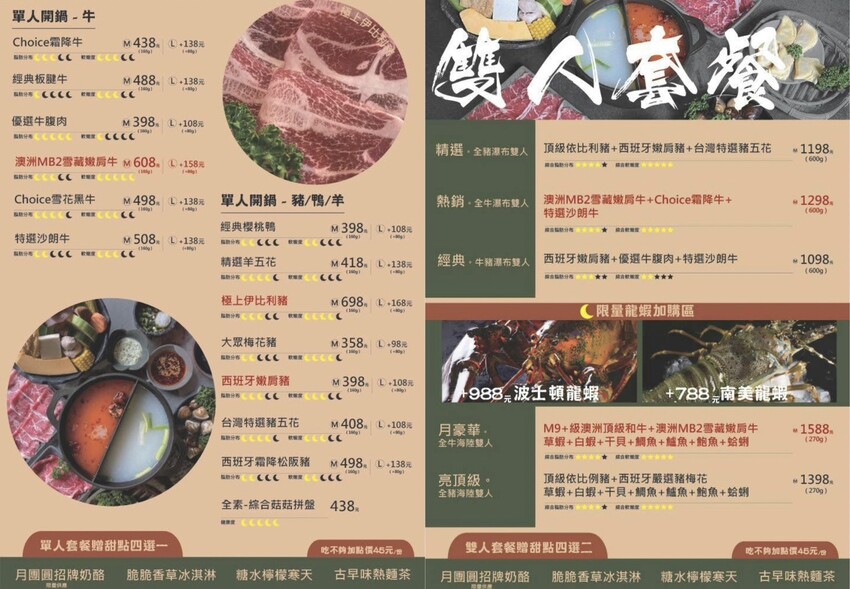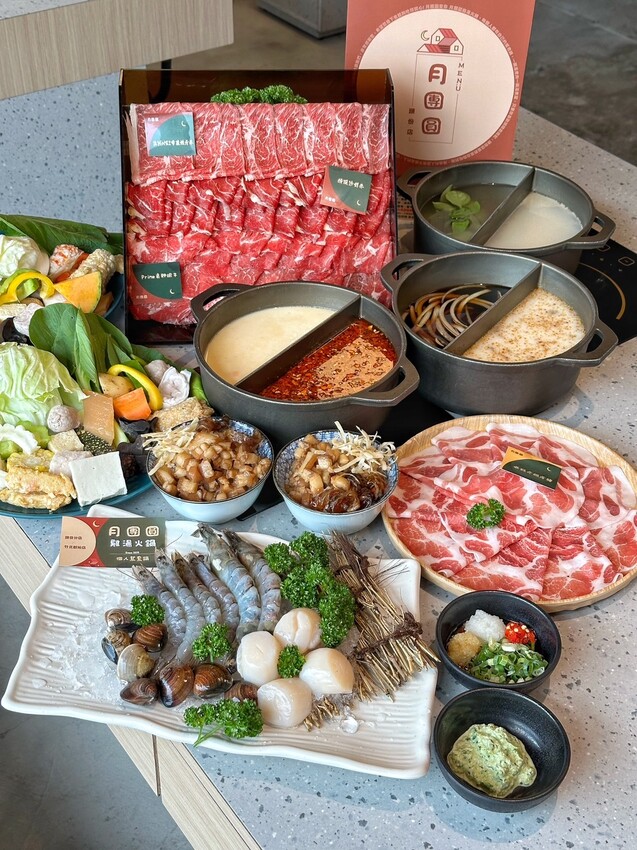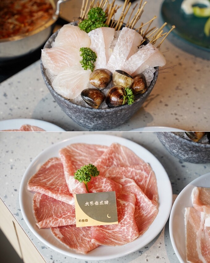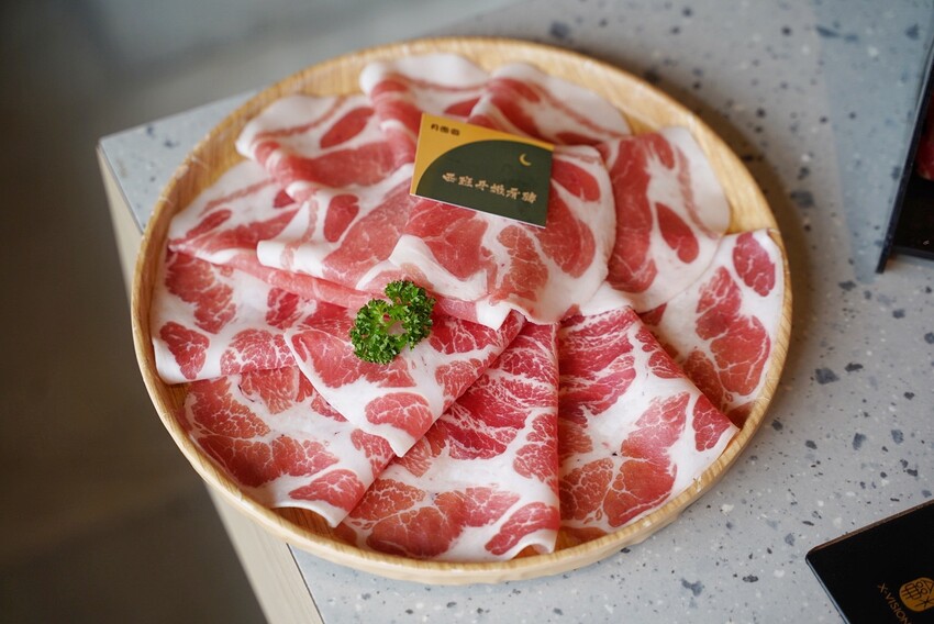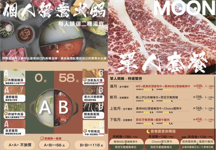 「月團圓雞湯火鍋」菜單提供每種肉品脂肪分布以及軟嫩度,讓客人找到最喜歡的口感,肉食控可以加價加大肉盤50%份量,兩個人來用餐的話可以點雙人瀑布肉盤套餐,比單人鍋多將近三倍肉量讓你吃得過癮。