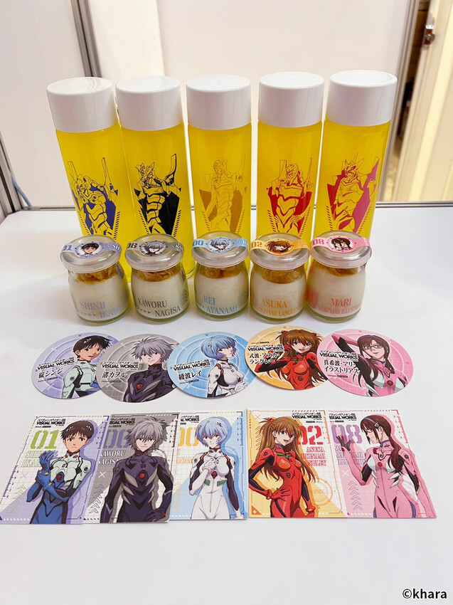同場加映暱稱「阿水」的軟Q可愛的 YURUHSITO 扭蛋印章等紀念小物,以及軟嫩風味奶酪、香甜可口的 L.C.L 柳橙汁,瓶身均有 EVA 元素&機體設計,並搭配對應的角色小卡及隨機杯墊。