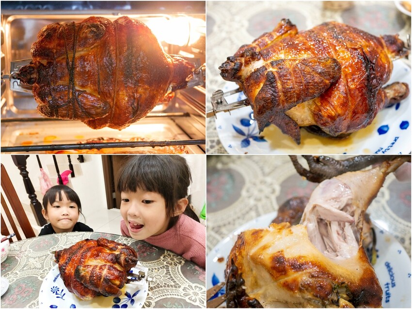 烤雞居然出乎意料的簡單!只要準備好食材串好後,放入烤箱選擇烤雞模式,接著就等待完成!成品也相當厲害!外皮香酥,雞肉軟嫩多汁,非常好吃!沒想到烤全雞也可以在家自己做!