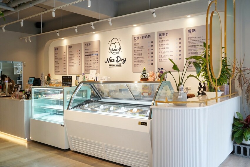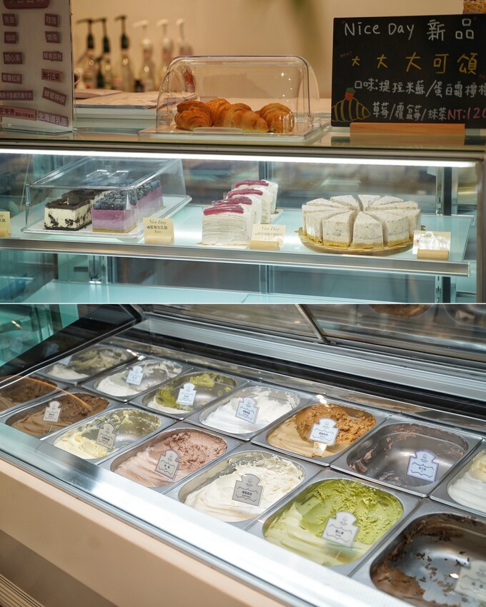 「Nice Day義式冰淇淋」現場販售12種口味,陳列在玻璃櫥窗裡,看到喜歡的口味都能試吃,喜歡再買就好,目前總共研發出30種不同風味,會依季節不同而替換,全都是使用義大利進口原料,「Nice Day義式冰淇淋」主打以台灣盛產農產品製作出的義式冰淇淋,像是椰香荔枝、火龍果、無花果、紅心芭、蜜香紅茶、旺來青等等,果香、茶香、花香通通有,而且天然食材製作更降低了熱量的攝取,完全是老少咸宜,另外脆皮甜筒也是自己手工製作的喔!店內也有提供各式手作甜點,不能錯過爆漿可頌,口味選擇多元,其他還有鹹食、各式飲品等等選擇。