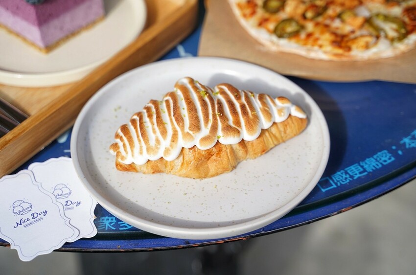 手工甜點推薦「大可頌」,當天點的是蛋白霜檸檬口味,上層還有炙燒蛋白霜,裡頭還有爆漿的檸檬卡士達內餡,酸甜滋味非常過癮。