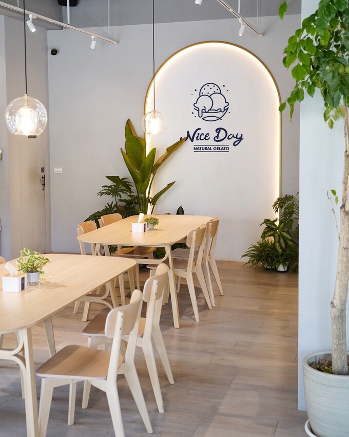 「Nice Day 義式冰淇淋」店內裝潢走簡約乾淨路線,大片落地窗還能欣賞歐風庭院景色,店內有靠窗單人高腳吧台座位以及四人座位區。