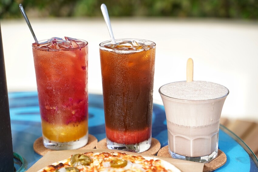 「草莓氣泡美式咖啡」為冬季限定產,有著淡雅的草莓香氣,不搶走咖啡味道,搭配爽口的氣泡感真的蠻順口好喝的。「鳳梨桂花綠茶」花香、茶香、果香一次滿足,喝起來很有層次感。「藍莓巧克力奶昔」口感很濃郁,上層是綿密的奶泡,底層是奶昔本體,喝完稍有飽足感。