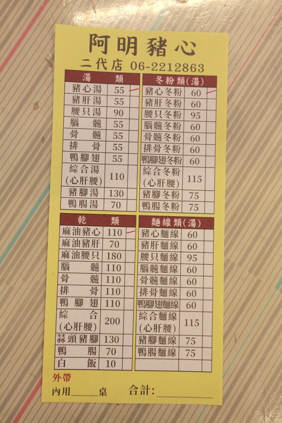 小高點豬心湯55元、麻油豬心110元、豬心冬粉60元及蒜頭豬腳130元等。