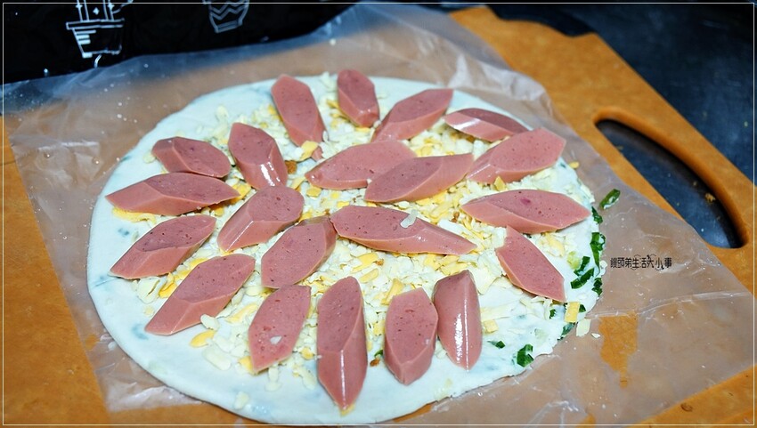 像我就是把依嬤手工蔥油餅拿來當肉鬆起司餅,只要在蔥油餅上面鋪上肉鬆跟起司就可以
