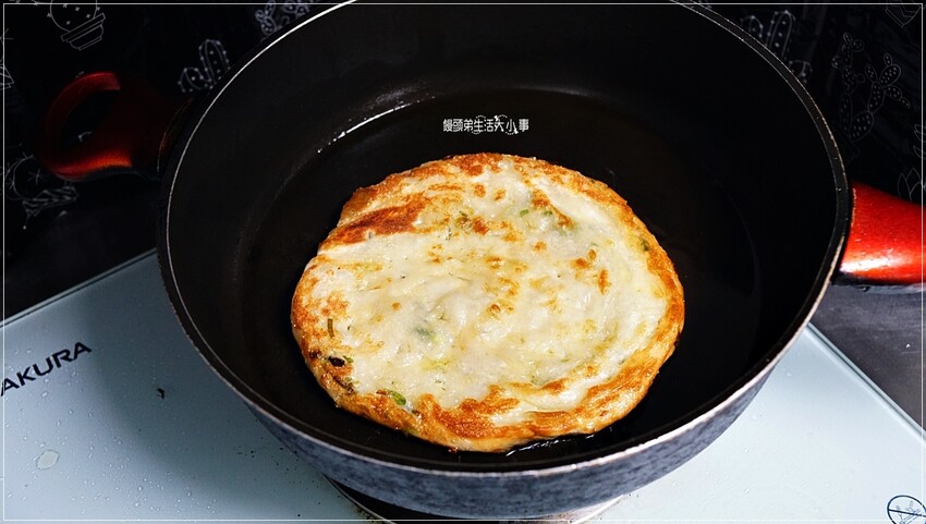 依嬤手工蔥油餅最簡單的吃法就是下鍋煎,而我個人更喜歡加上一顆蛋,讓這蔥油餅的味道更上一層樓