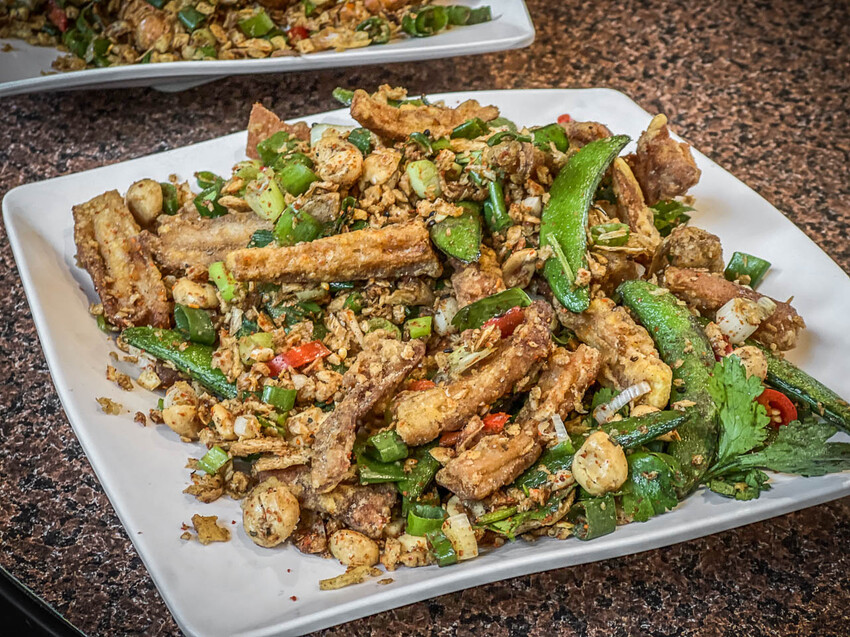 鹹酥蝦,也是用大尺寸的白蝦,大火炸過後加入辛香佐料拌炒,上面灑了滿滿的胡椒鹽跟蒜酥,ˋ整隻蝦炸的酥酥脆脆,可以連殼整隻吃,然後裡面還加了很多油花生,佐料直接用來拌飯也很讚