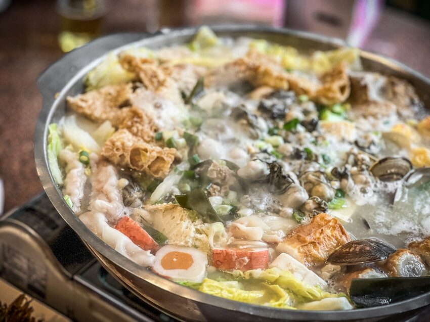 海鮮火鍋(味增),這一大鍋850元,整個鋼盆端上來超霸氣,這鍋海鮮火鍋也是會讓人稱讚,裡面有大量白菜、火鍋料、蛤蠣、小珠貝與牡蠣等等,味增湯底不會鹹,卻有海鮮所散發出來自然鮮甜,隨手一撈都是滿滿的料,冬天來上一鍋真的舒服,人少其實也可以點,喝不完打包回家一樣好吃