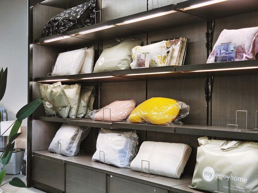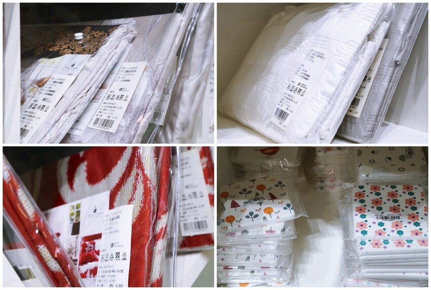 ▼現場販售的枕套有纖維、鋪棉材質,與多種花色的被單,可愛圖案的杯墊只要提前預約到店體驗就能收到小贈品。