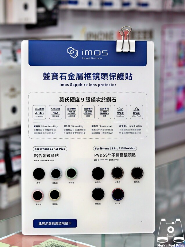 - imos藍寶石鏡頭保護貼:iPhone15系列原價是550元,在地標購買只需要499元;iPhone15 Pro系列原價800元,在地標購買只要599元。