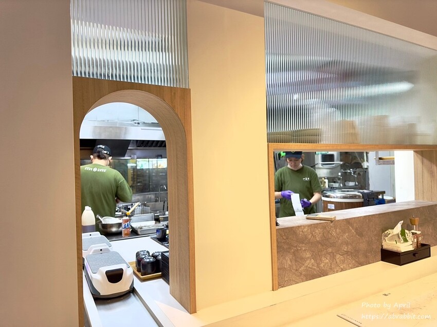 座位區不多不少,整體環境看起來還蠻乾淨清潔的,半開放式的廚房,隱約可以看得到裡頭師傅在用直火燒肉的情況。
